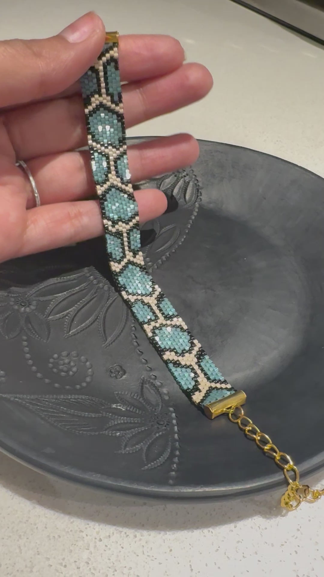 Handwoven bead by bead using the peyote stitch.